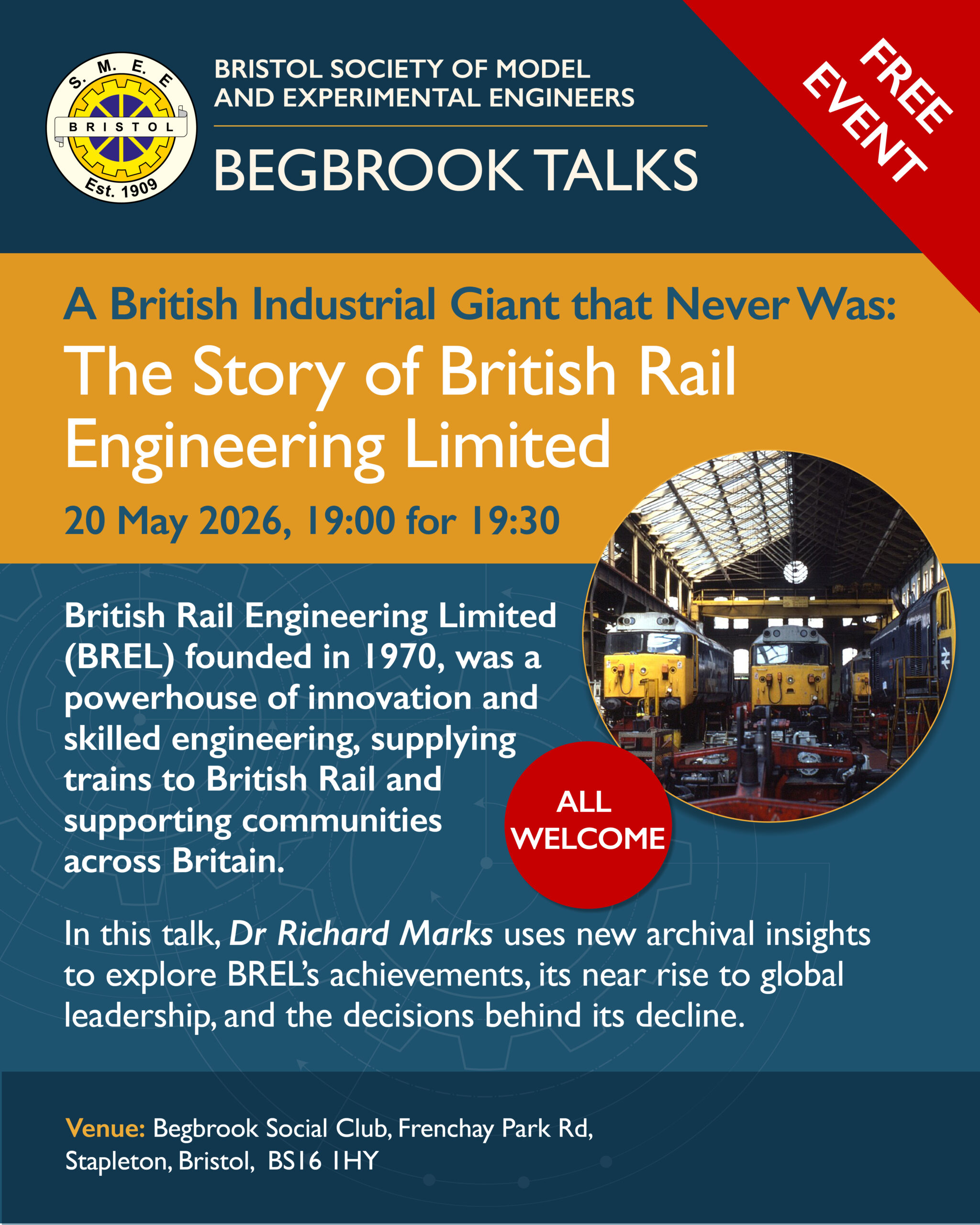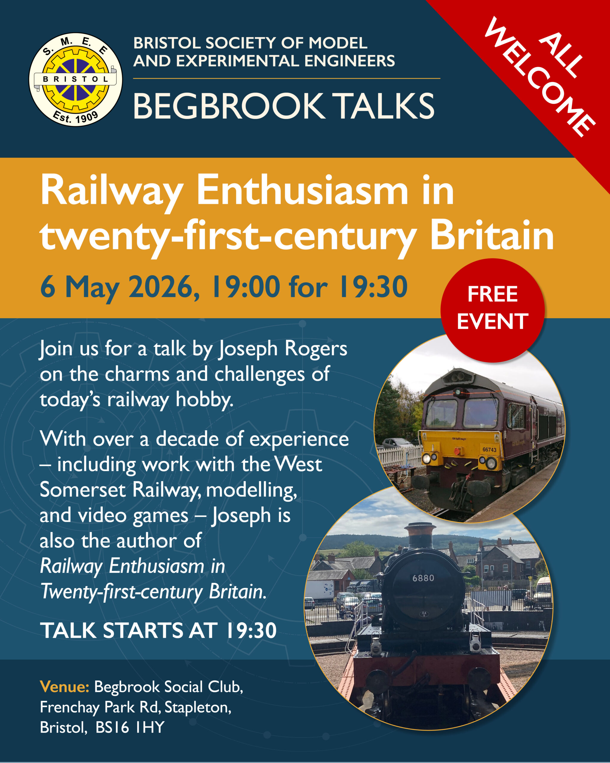 We hold public running days at Ashton Court Railway and bi monthly lectures covering model engineering and related topics at Begbrook Community Centre where everyone is welcome, so come along and enjoy.